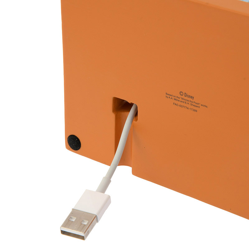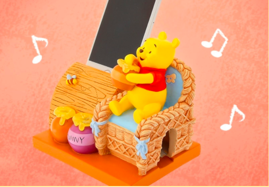 小熊維尼抱著蜂蜜,坐在木藤椅上面的樣子超可愛!如果使用這款揚聲器撥放歌曲,就有種維尼坐在旁邊聽的感覺呢!它的內部有一個孔可以放充電線,另外,妞編輯覺得,如果單純拿來當手機座也很合適呢。