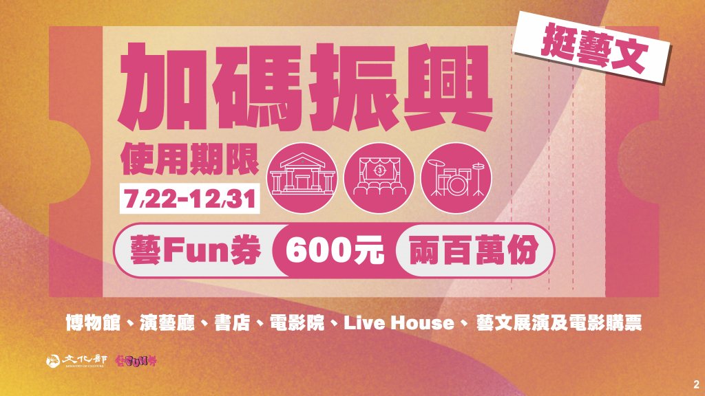 繼振興三倍券及安心旅遊國旅補助方案之後,文化部6月11日提出每人600元的「藝Fun券」,以「藝文專用、不限區域使用」為原則,民眾自7月22日起,可在電影、書店、博物館及藝文展演使用。