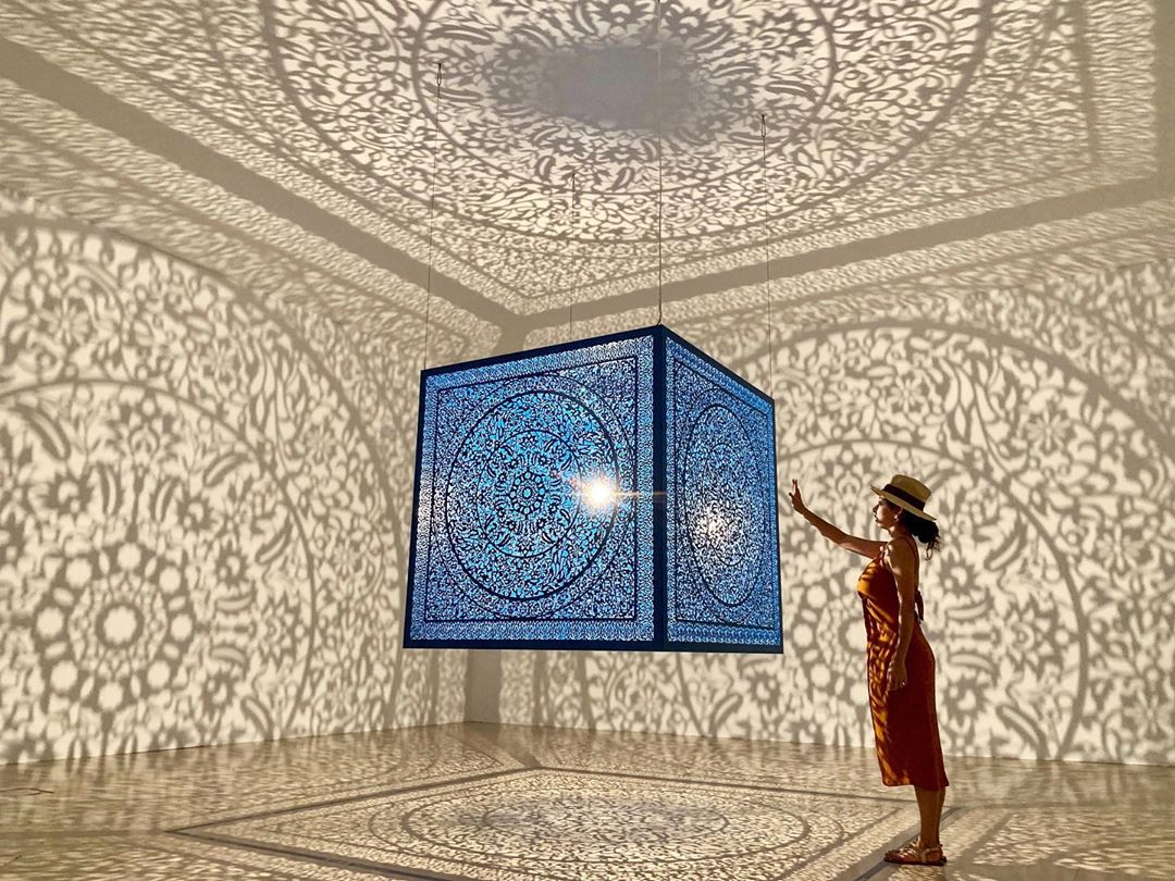 這個場景,是最多人打卡的場景,從簍空的雕花方塊中,點亮一盞燈讓整個房間充滿了這些花影,這個作品是藝術家「阿妮拉.卡尤姆.阿嘎(Anila Quayyum Agha)」的作品《給自己的花》。