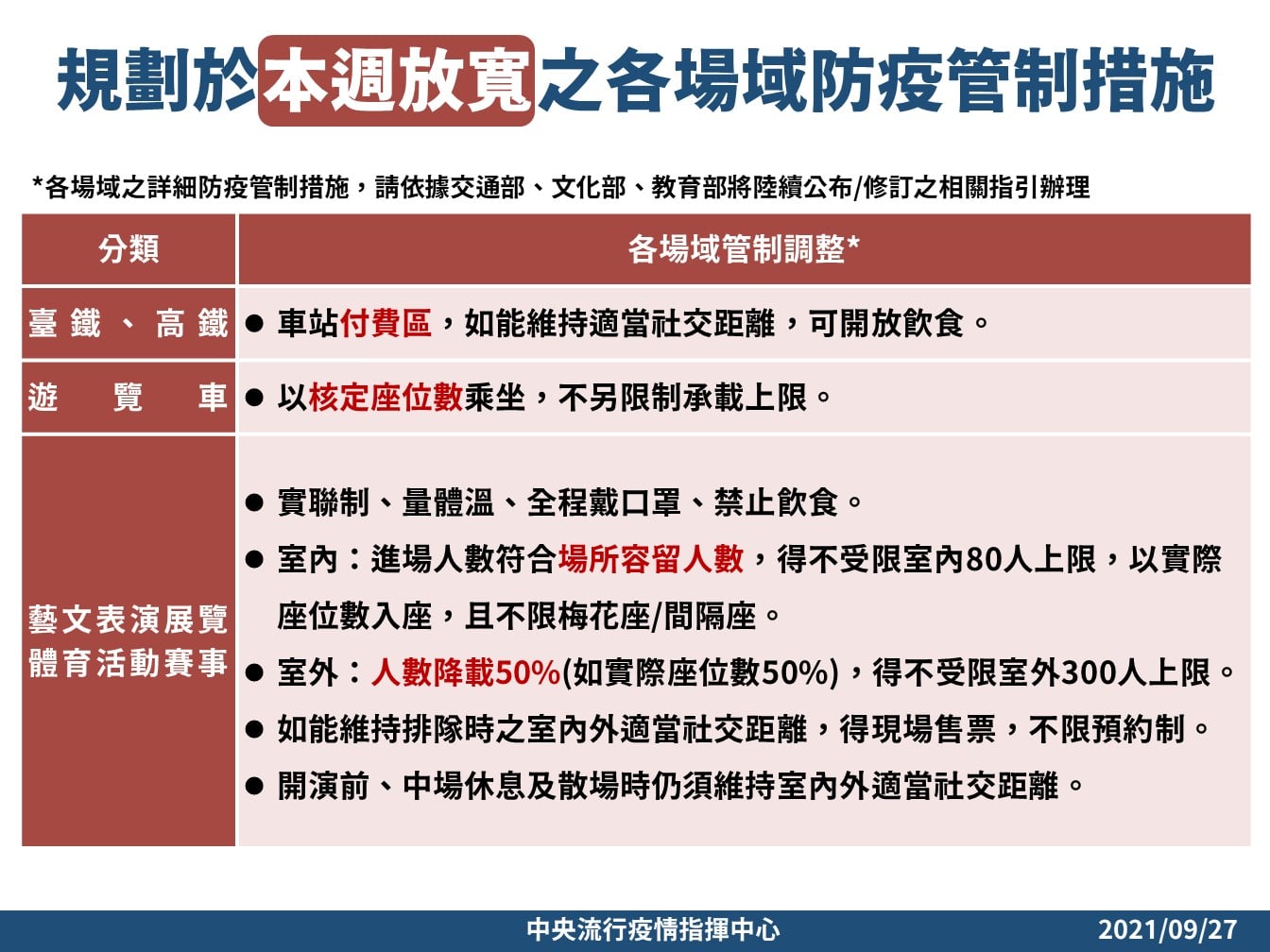 中央流行疫情指揮中心表示,考量國內疫情目前已趨緩且穩定控制,經與相關單位溝通討論及評估後,指揮中心規劃於9月27日起放寬部分場域防疫管制措施,並於10月5日起有條件開放部分休閒娛樂場所,大家也要落實手部衛生、咳嗽禮節及佩戴口罩等個人防護措施,並主動積極配合各項防疫措施,才能達到兼顧防疫與生活品質!