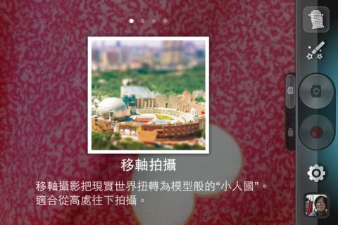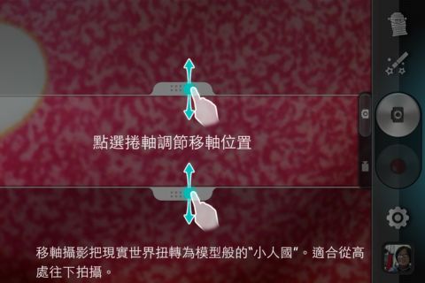 進入每個攝影模式,都可按下工具列旁的i按鈕觀看介面的說明。在移軸模式中,你還可以以指尖移動調整移軸位置,這個模式適合用在高處拍攝。