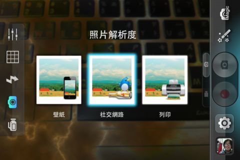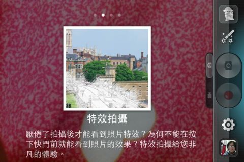 首先當然來介紹一下PowerCam裡頭的攝影功能。PowerCam總共有四種攝影模式,包含「特效拍攝」、「脫色拍攝」、「智能拍攝」及「移軸拍攝」。按下右手邊工具列最上方的按鈕即可轉換,不同攝影模式下,這個圖示也會有不同的顯示狀態,很容易辨別。