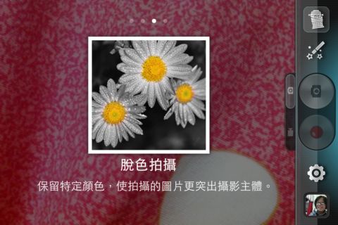 使用「脫色拍攝」模式時時,畫面會出現一個不時轉動的色環,你只要將它移動到你所要凸顯的區塊上方,再多點擊一下,就可以有脫色拍攝的效果!