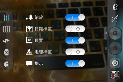 此外,你也可以在拍攝的時候,針對閃光燈、輔助格線、照片解析度及加註日期等功能進行更詳細的設定,只要按下工具列下方的齒輪按鈕就可以進入設定。