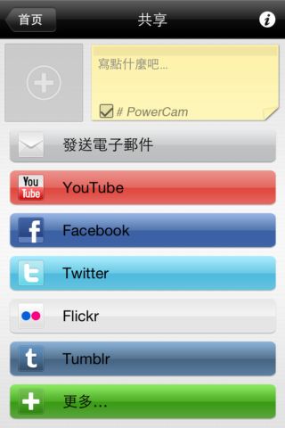 拍攝了這麼多的好照片、好影片,不跟朋友分享的話就太過可惜了!在PowerCam當中,點選畫面左上方的房屋圖示,就可以回到首頁。選擇「共享」就可以透過Facebook、Youtube、Twitter、Flickr或是Email等方式進行分享唷,重點PowerCam厲害的是,居然連微博的選項都有唷,這些應該就可以滿足非常多人的需要了!