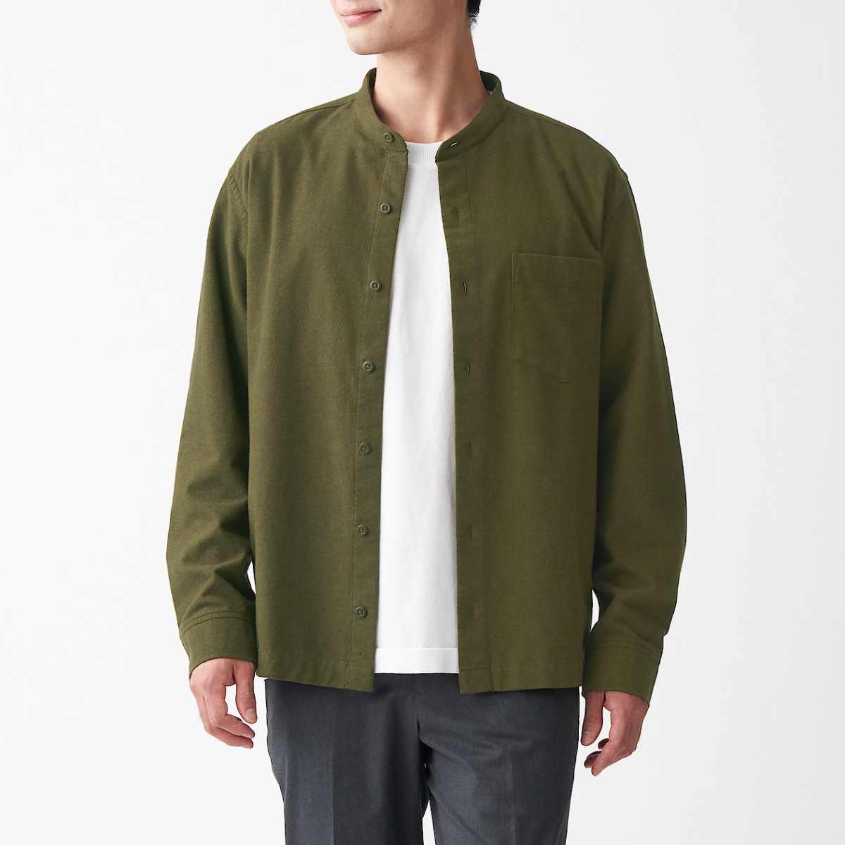 以有機粗織線織製的法蘭絨襯衫,搭配上起毛加工,增加了布料溫暖舒適的穿搭感,簡約立領的設計,無論是日常或是週末出遊都非常適合搭配!