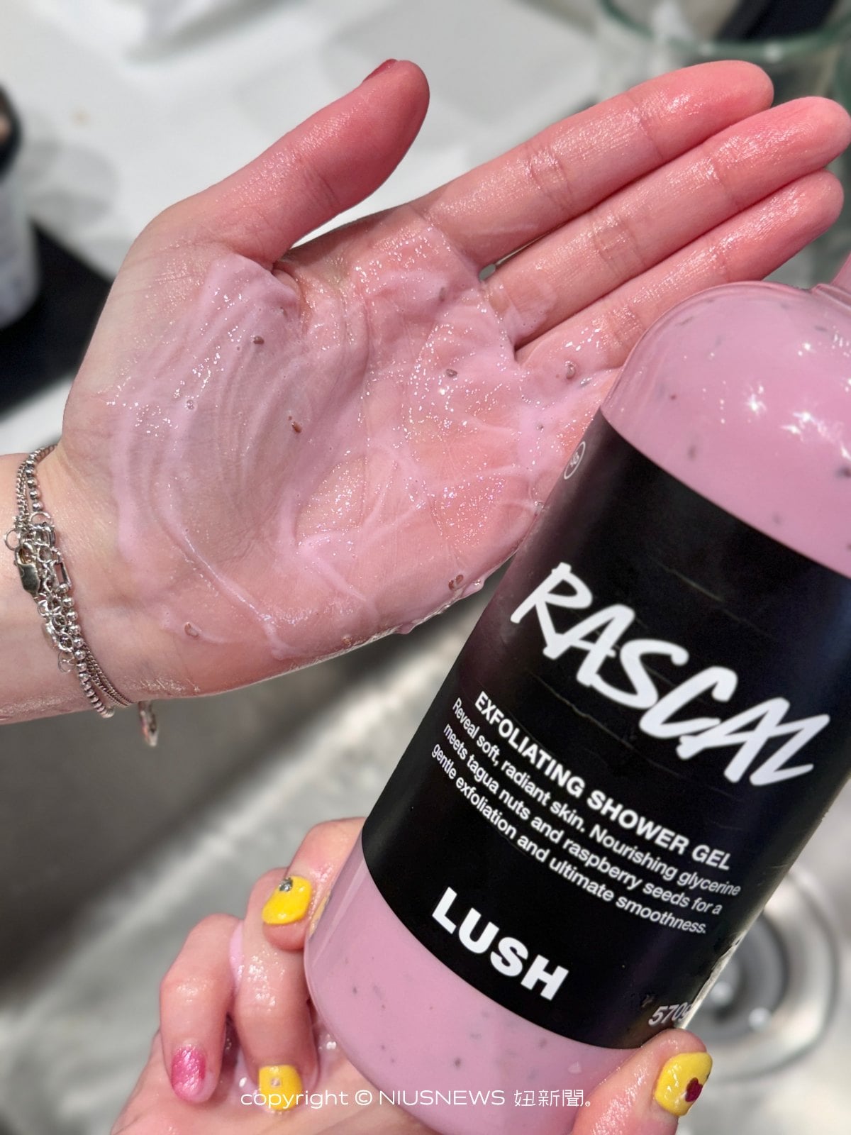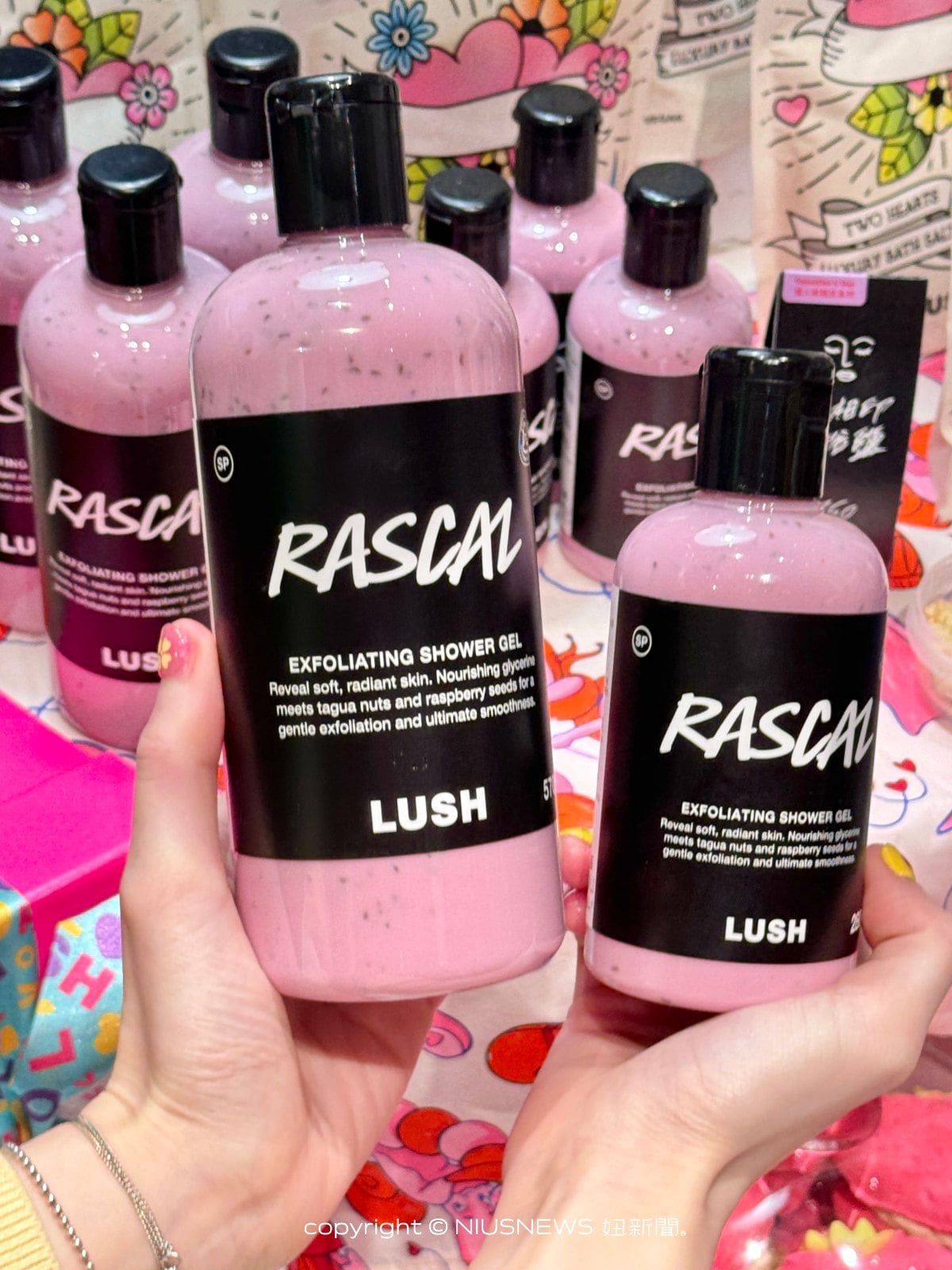 沐浴同時磨砂去角質,LUSH第一次推出磨砂沐浴露,結合滋潤甘油、研磨象牙果及覆盆子籽,為肌膚溫和去角質並打造柔滑觸感,同時散發讓人難以抗拒的覆盆子玫瑰香氣,每次洗完澡後,自己都忍不住一直摸,太柔嫩了!