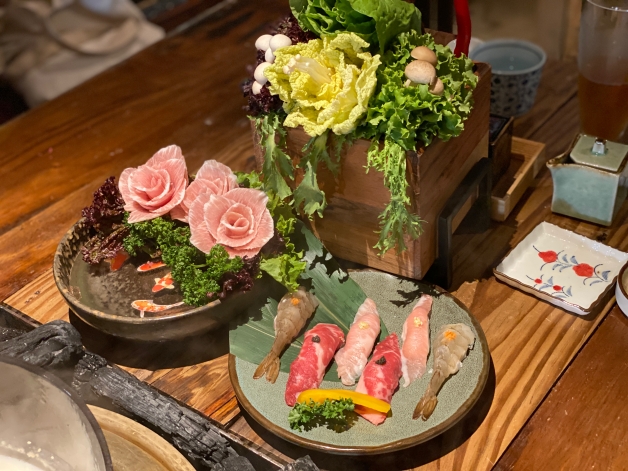 延續一店的經典鍋物,以使用豬大骨長時間熬煮的「豚骨千叟」為湯底,依序放入「花團錦簇」菜盤、玫瑰花造型的「松阪豬」和外觀宛如壽司的的蝦滑「壽司滑」,妞編輯大推喜歡吃辣的妞妞們可選擇「麻辣醬」,麻而不辣的風味,超!級!上!癮!