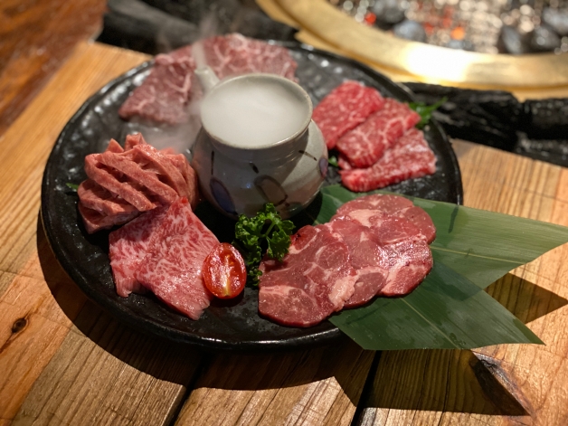 「牛肉燒肉拼盤」包含油花少且肉質滑順多汁的「澳洲巧克力和牛內橫隔膜」、軟嫩卻不失嚼勁的「日本和牛橫隔膜」、油脂豐富的「舌下肉」,以及最特別的「DNA牛舌」,以刀功獨具的蛇腹切法展現出有如DNA基因紋理,口感鮮嫩多汁,四款燒肉都是珍稀部位呢!