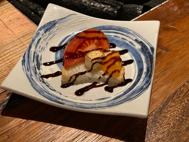 前菜為「番茄乳酪佐黑醋」,以法國麵包為基底,鋪上蕃茄、蜜柑和乳酪,佐以義大利巴薩米可醋,乳酪風味較為厚重,但搭配醬料達到平衡,清爽又開胃!