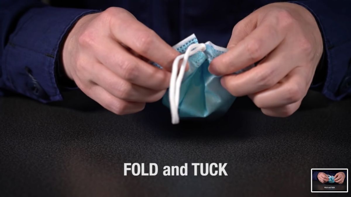 影片中美國CDC的護理人員就示範了如何將口罩折成適合臉部的大小,首先是將口罩上下對折,接觸臉的那一面朝內,再將兩邊的口罩繩打結越靠近口罩越好,再將口罩與繩結之間的布料折好並塞進去,讓口罩邊緣呈交叉的密封狀。
