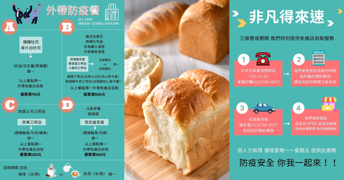 位在民生社區的非凡Viva Bakery,推出免進店的「非凡得來速」,客人僅需提前預訂並於指定時間抵達,告知預約單號後就會有人遞上餐點,不僅省時方便更安心。除了貼心服務,非凡Viva Bakery也推出了防疫套餐,從義式帕里尼、經典白吐司到貝果、班尼迪克蛋等一日三餐都能盡情享用。
