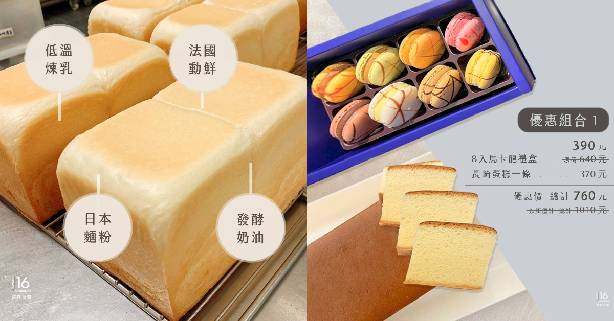 擁有被譽為天母最難買到的吐司的甜典16號,店內每日限量24條的生吐司總是營業時間一到就被預訂一空,但搶不到生吐司沒關係!甜典16號防疫期間推出馬卡龍禮盒+長崎蛋糕的優惠組合,或購買任一款式生日蛋糕,均可以優惠價加購馬可龍禮盒,在家享受甜蜜奢華的下午茶。且現在凡購買切片蛋糕滿500元,或訂購生日蛋糕1顆,只要欲送達地址距離甜典16號3公里內還可享免運服務優惠。