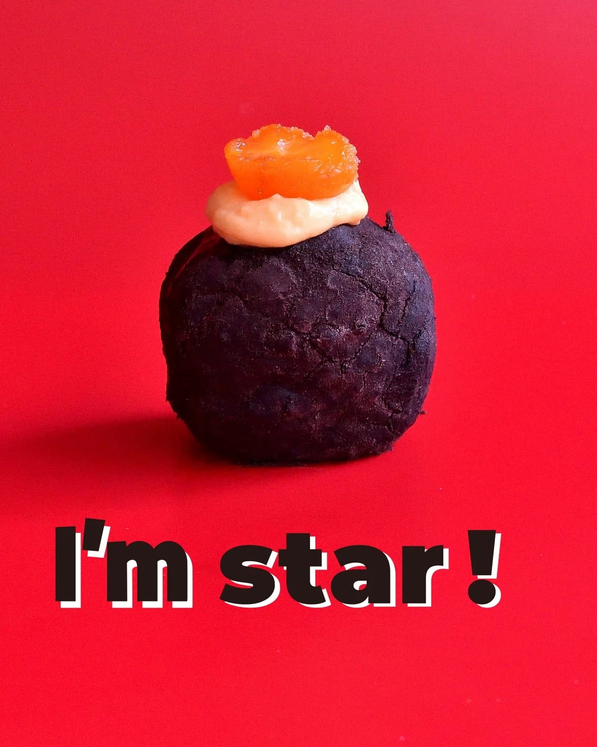 「I'm star!」是以《ENEMY》概念照中的黑色服裝為靈感製作。在巧克力生甜甜圈中,填入自製卡士達與鮮奶油調和而成的外交官奶油,並豪邁地塞入多汁的無花果,最後再以砂糖漬蛋黃作點綴。卡士達特別增加蛋黃比例,讓色澤跟口感更加鮮黃、濃厚。為呼應黑色服裝,外層也以黑可可粉裹。在巧克力與卡士達風味中,還可品嚐奢華的無花果香氣。
