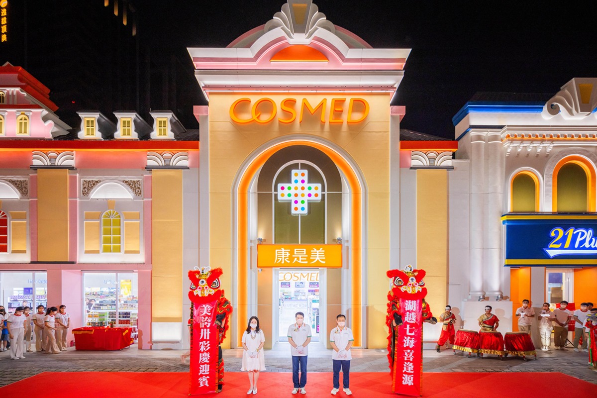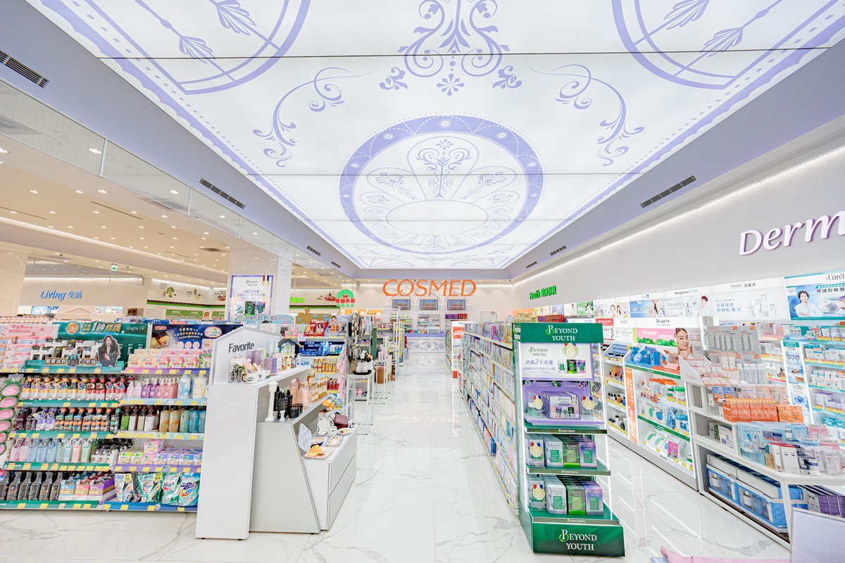 康是美延續店外風格,以優雅淡紫的古典窗花弧線,融入天空穹幕與環店裝飾,呼應玻璃櫃台雕飾流線,營造柔和高雅體驗。超過40個國際專櫃及醫美保養品牌,精選全球30大彩妝、香水品牌,結合彩妝師的免費試妝服務,優選知名生活品牌CANDO、日韓高端髮品與生活用品,並規劃保健專區與藥師駐店,加上聖德科斯生機飲食,同享生活中的健康與美麗。