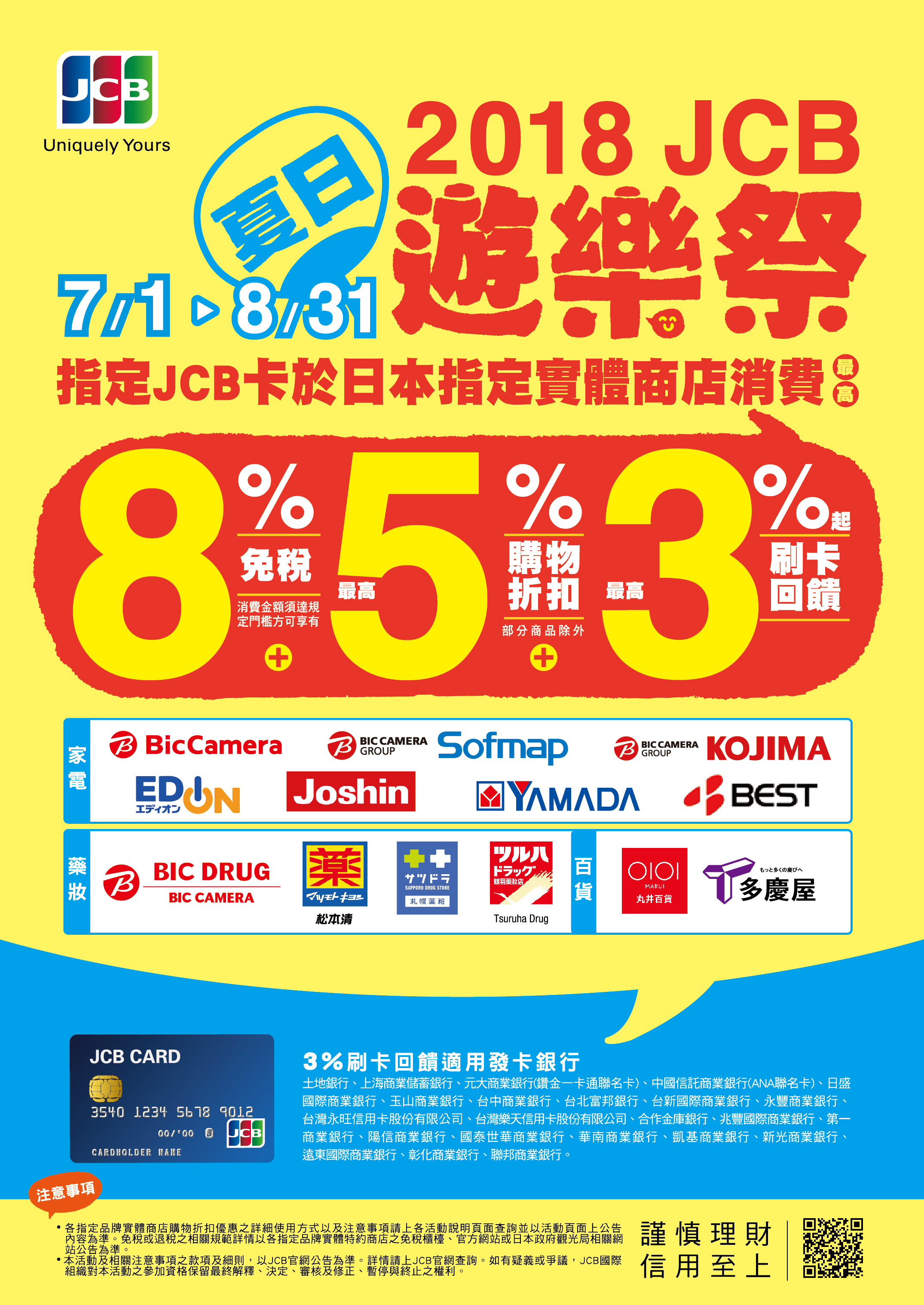 OK~好康當然不私藏啦!就是要讓大家到日本蝦拼時買好、買滿,才准回台灣!XD ,即日起至8月31日止,持臺灣地區指定發卡銀行之指定JCB卡