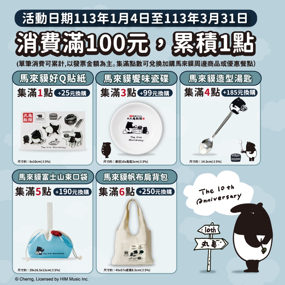 從2024年1月4日至3月31日,踏入全台丸亀製麵門市的每一位顧客都可參與這場美味慶典。每消費滿100元,即可累積1點,200元則累積2點,以此類推;1點起即可加價兌換丸亀製麵 × LAIMO好Q貼紙、饗味瓷碟、造型湯匙、富士山束口袋與帆布肩背包等聯名周邊商品,數量有限,想要收集全套周邊商品的LAIMO迷可得加緊速度集起來!