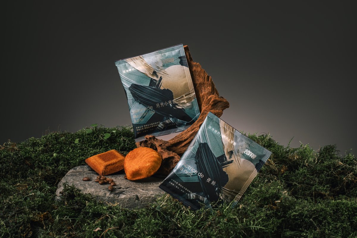 呼應今年咖啡入甜點的創作主軸,創辦人Rick力邀好友-達文西咖啡創辦人蔡治宇為「月夜印象」禮盒量身定製兩款藝伎配方濾掛包。月光小夜曲是一款衣索比亞與哥倫比亞兩支淺焙藝伎豆的組合,前段有柑橘、檸檬、水蜜桃等多層次水果香氣,搭配綿長的綠茶香氣尾韻、滋味轉折迷人。夜姈則是衣索比亞咖啡豆、多種烘焙度的拼配作品,入口先感受奔放強勁的花香果酸,隨後釋出香甜可可尾韻。搭配深法甜點,在口中激盪出豐富味譜,大「咖」助陣更令深法「月夜印象」禮盒獨一無二、值得品味!