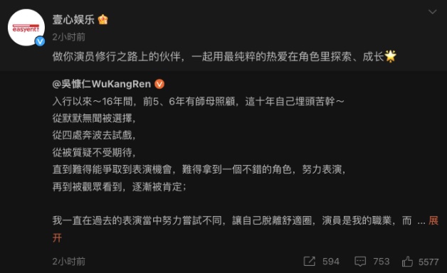 中國壹心娛樂在微博以「『吳』限可能、『壹』起前行」歡迎新朋友,也轉發吳慷仁微博「做你演員修行之路上的夥伴,一起用最純粹的熱愛在角色裡探索、成長」。日前也傳出吳慷仁與孫儷正在拍攝情感懸疑陸劇《執迷》,妞妞們一起為吳慷仁加油吧!