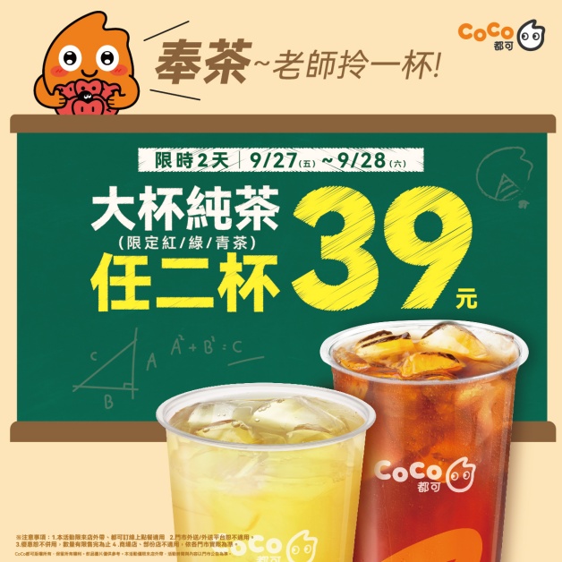 CoCo也祭出優惠,要和大家一起慶祝教師節!9月28日當天,大杯純茶(限定紅/綠/青)任兩杯只要39元就能喝,炎炎夏日,就是要來杯冰涼的純茶啊~消暑又解膩,和任何食物都超搭!