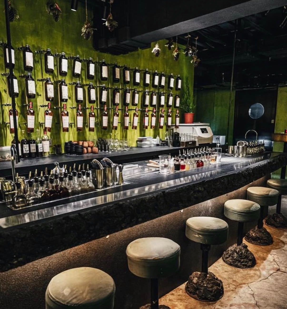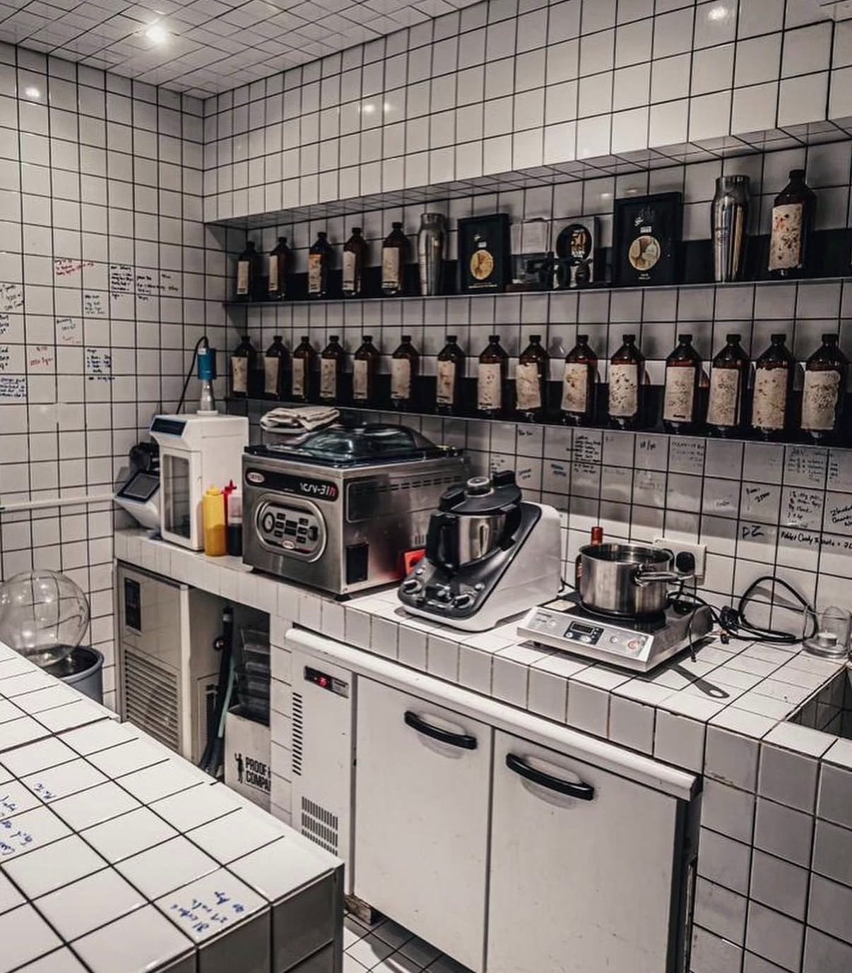 牆上寫滿了化學公式般的筆記,這是調酒師們研發風味的痕跡。這種強烈的視覺衝擊,不僅好拍,更讓人對即將入口的每一杯「液體解藥」充滿期待。特別是那台看起來超專業的旋轉蒸發儀,可是這裡提煉風味的神器呢!
