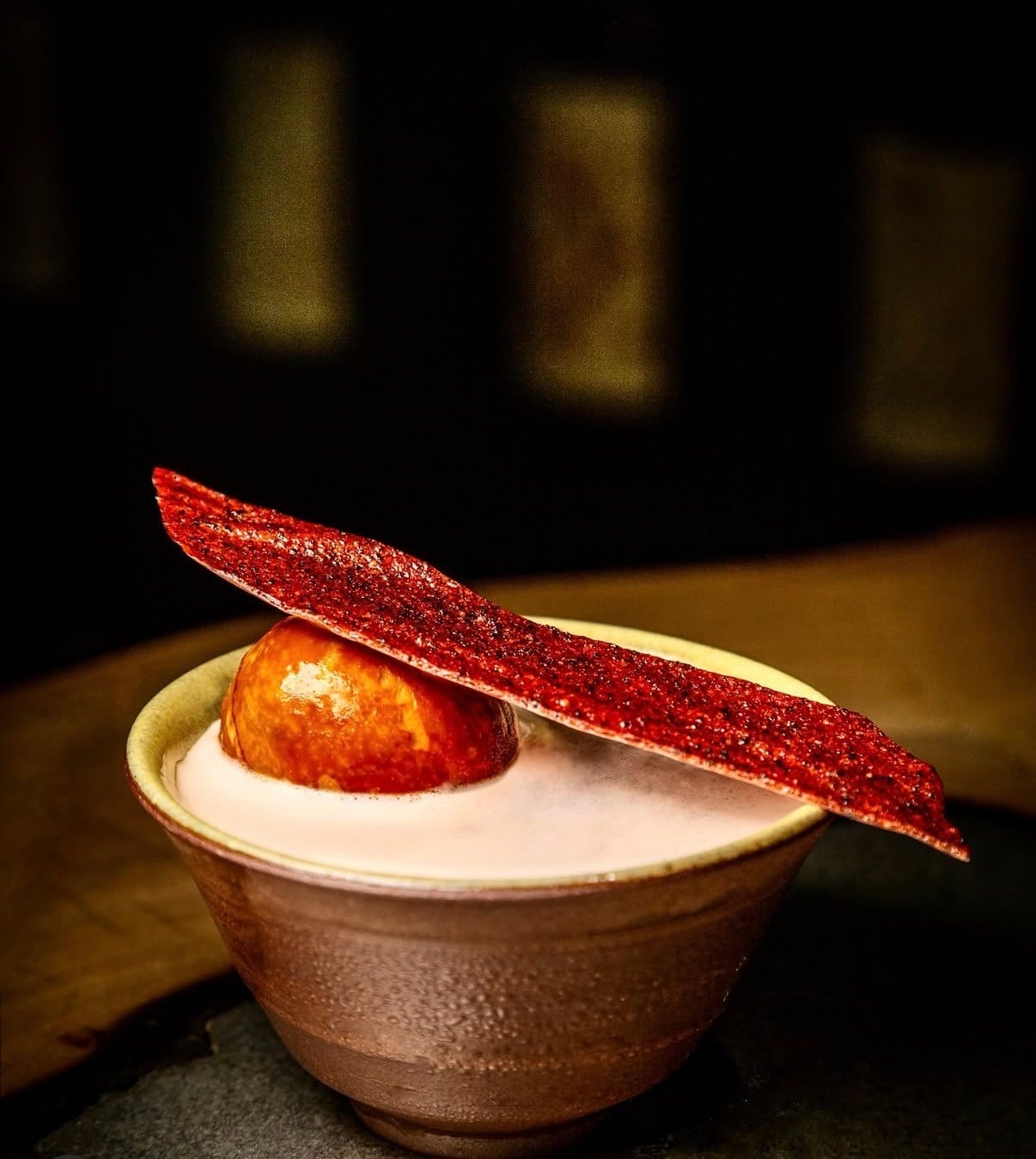 那些原本要被丟進垃圾桶的食材,經過時間的魔法催化,竟然變成了雞尾酒中令人驚艷的酸甜層次。像是這杯視覺搶眼的調酒,上方搭配的裝飾片可能就是利用廚房剩料重新烘乾製作的,口感酥脆又充滿風味,完美體現了零浪費的精神。