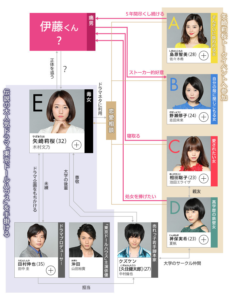這部由人氣戀愛小說改編的《伊藤君A to E》,故事在描述一個名為伊藤的渣男,周旋於A~D四女之間的故事,而E則是指編劇矢崎莉櫻,她在片中聆聽四女的戀情煩惱,一邊給出她們建言、卻也一邊將此作為能讓自己翻身的劇本題材,是個有些現實的毒女角色。
