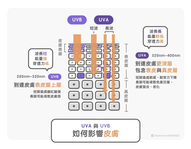 UVB 的波長較短,穿透力較低,傷害主要在表皮層,但能量較強。因此容易造成曬紅、曬傷,而長期累積的能量大,也可能造成皮膚癌。但因為 UVB 的穿透力較低,防護的難度比 UVA 低。至於有關如何早期發現皮膚癌,請大家參考這篇文章。