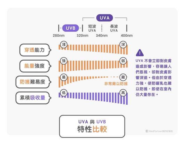 看到這,大家應該已經清楚 UVA 跟 UVB 的差別,兩者穿透的能力不同,造成的影響也不同,所以防曬的時候,應該要搞清楚自己的目標到底是什麼?如果你根本不怕黑、曬老,只怕曬傷的話,那把降低UVB的傷害就沒問題了。如果你擔心的是曬黑、曬老的話,那就要更全面降低 UVA 的暴露。
