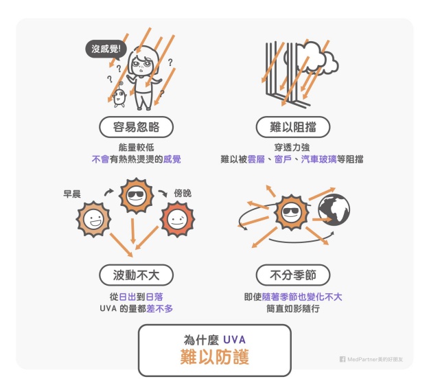 但是 UVA 的防堵,其實非常困難。剛才已經有講過,波長越長,穿透能力就越強,因此長波的 UVA 基本上是很難阻擋的。因為它能量低,所以即使你暴露在大量 UVA 下,也不會有像 UVB 暴露那種熱熱燙燙的感受。UVA 也很難被雲層、窗戶、汽車的擋風玻璃所阻擋。更麻煩的是,UVA 從日出到日落其實波動不會太大,即使是隨著季節變化,冬天跟夏天的 UVA 強度也相差不大。長波的 UVA 簡直就是一年四季、如影隨形,跟背後靈一樣死纏著你,很難躲得掉啊!