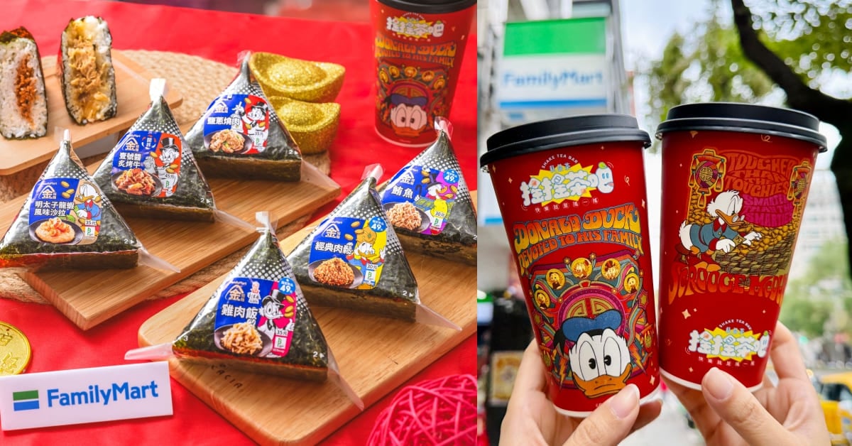 金飯糰、搖搖茶吧也換上新包裝,「史高治叔叔」躍上金飯糰包裝,一共推出六種款式,包含經典的肉鬆、鮪魚飯糰;另,搖搖茶吧杯子則是以象徵福氣的紅色為底色,搭配可愛的唐老鴨家族,兩者搭配超可愛!