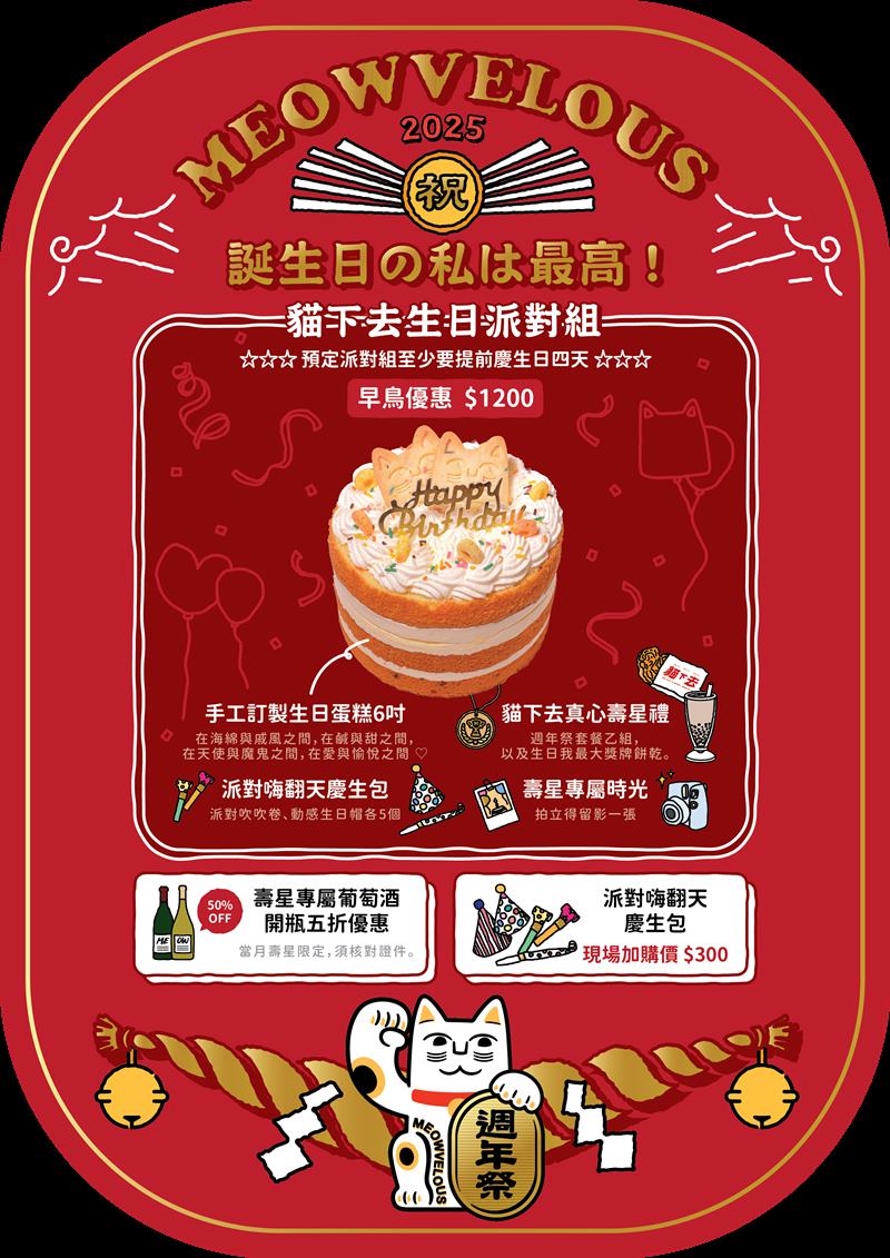 根據貓下去統計,每年有超過500組慶生聚餐在貓下去,也就是每年超過2,000位慶生貴賓在貓下去過生日、款待壽星及朋友。今年貓下去趁著週年慶,將推出往年只有熟客才知道的隱藏版「貓下去生日蛋糕」供顧客提前訂購!蛋糕體介於海綿與戚風蛋糕之間,口感輕盈,層次豐富,鹹甜風味達到完美契合!現在只要提前四天下單貓下去手工訂製6吋生日蛋糕,立即招待壽星吃香喝爽(週年祭雞排奶酒套餐組合,以及壽星獎牌大餅乾)、同時招待同行好友玩得盡興(派對嗨翻天慶生包、壽星專屬拍立得留影)。當然,貓下去認為過生日是一整個月的事,經典招牌的「當月壽星開瓶5折」,除了要給壽星最優惠的折扣一整個月、同時也替壽星與好友們打造最歡愉的時刻!