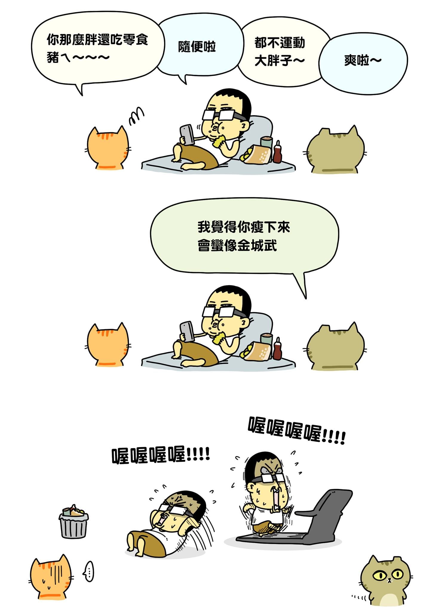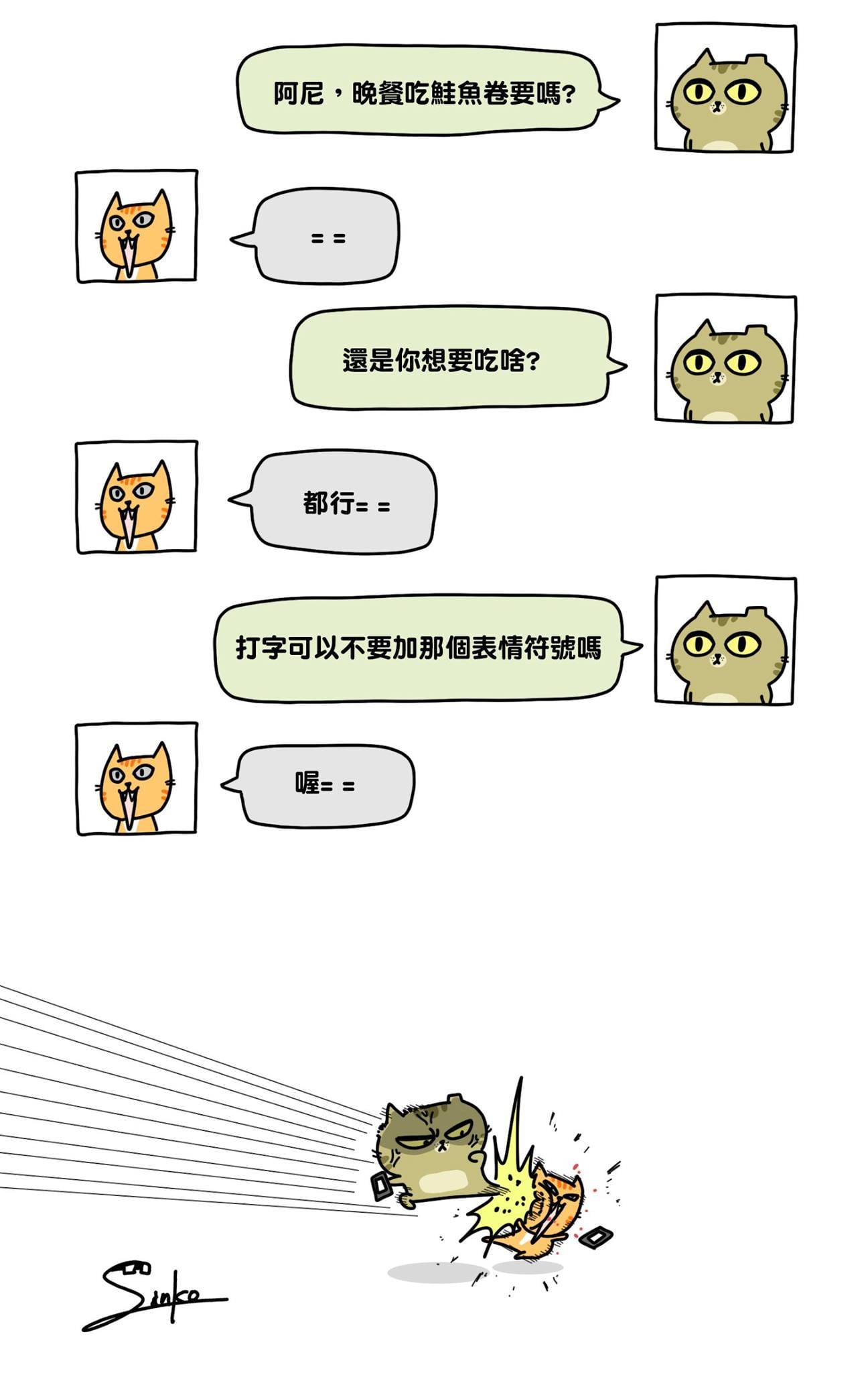 我很迷《海賊王》裡的角色,還有《抓狂一族》,我會參考《抓狂一族》誇張搞笑的表情套用在貓咪身上。台灣的角色的話,滿欣賞掰掰啾啾。