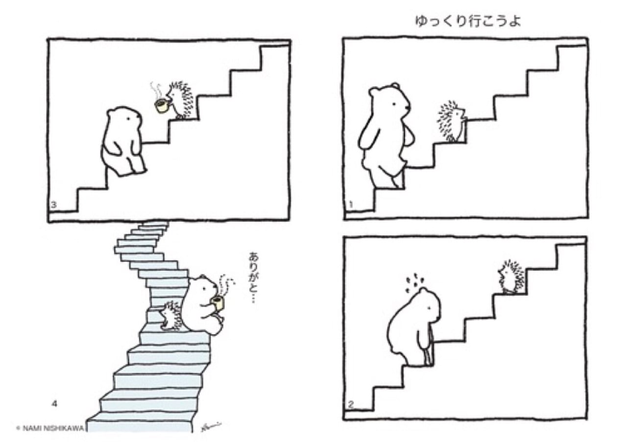 有沒有發現小刺蝟身邊有位好朋友小白熊呢?牠們的互動就像平時的我們,正當處於困難時千萬別灰心,不妨與牠們一起緩下腳步,為自己的心放個假。