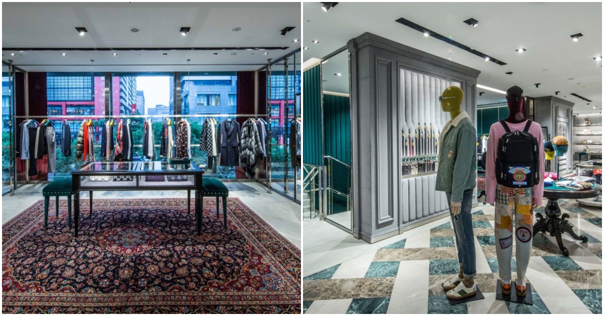 全新設計的外牆面以最新一季的視覺形象覆以大理石材質,彰顯摩登現代的風格。室內空間採用含蓄內斂的設計理念,有著Gucci復古華麗風格卻又拉近距離感。天鵝絨扶手椅等柔和元素,與冷調個性的鉚釘等工業風格帶來衝突的意象。精緻而獨特的材質打造當代奢華感。Gucci全新品牌方向呈現優雅和兼容並蓄的風格,而全新店鋪設計則完全體現了這一理念,結合傳統與現代,並融合工業風與浪漫主義。