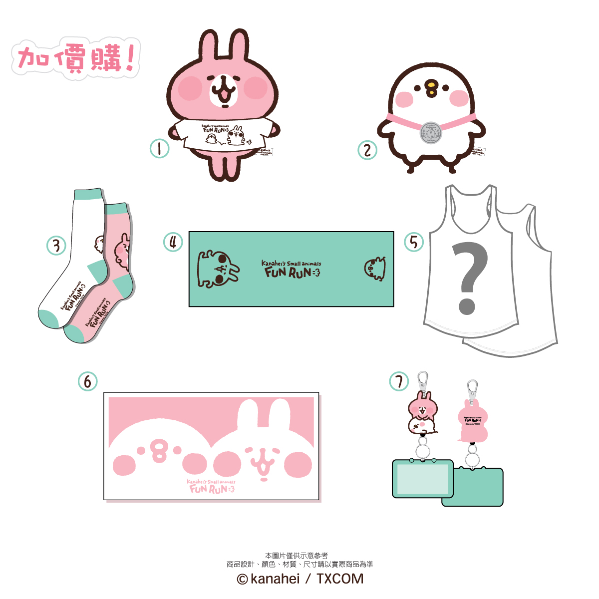 加價購商品*:1. 粉紅兔兔路跑玩偶 2. P助路跑玩偶 3. 雙拼短襪 4. 運動毛巾 5. 女版挖背背心 6. 夏日海灘巾 7. P助&粉紅兔兔伸縮票卡夾