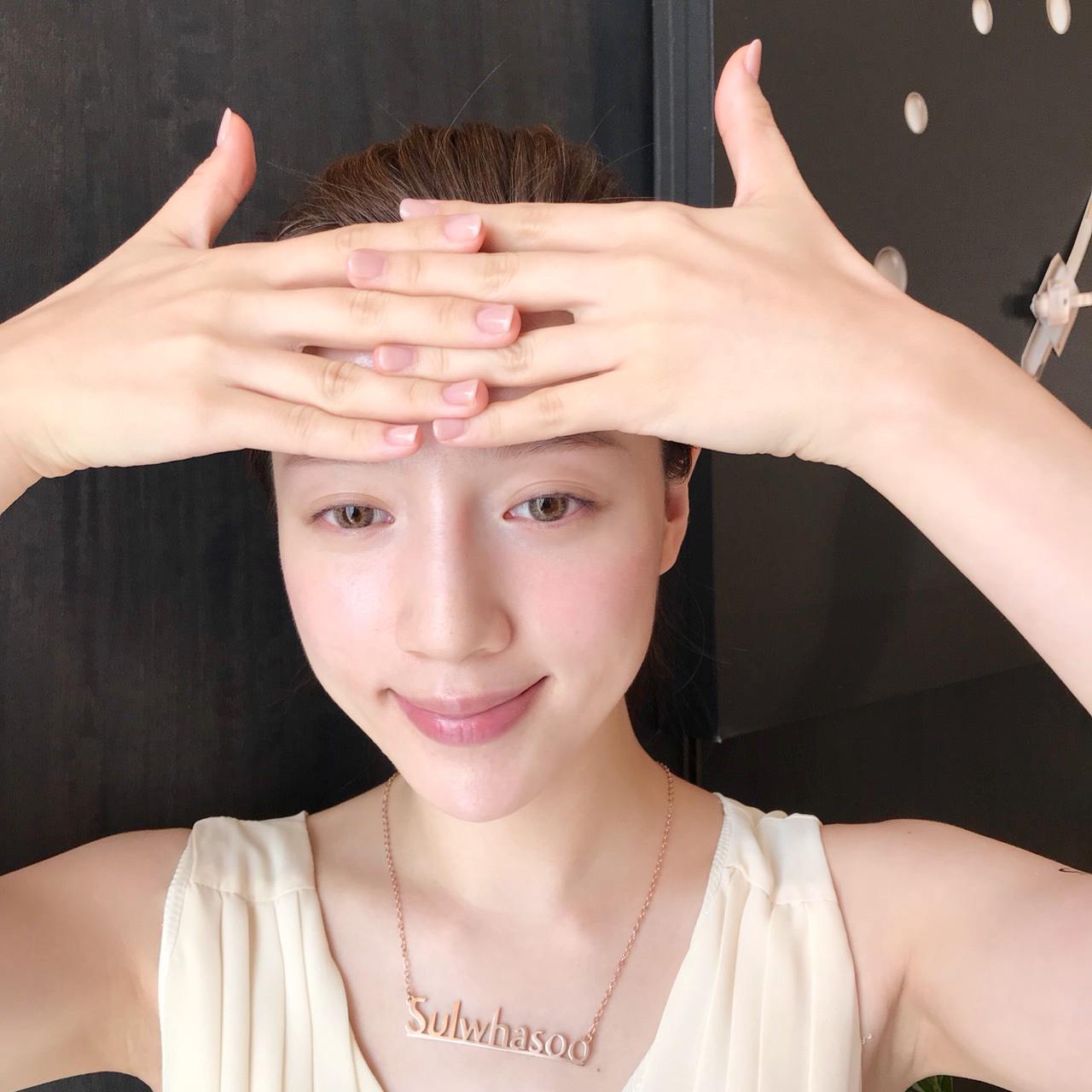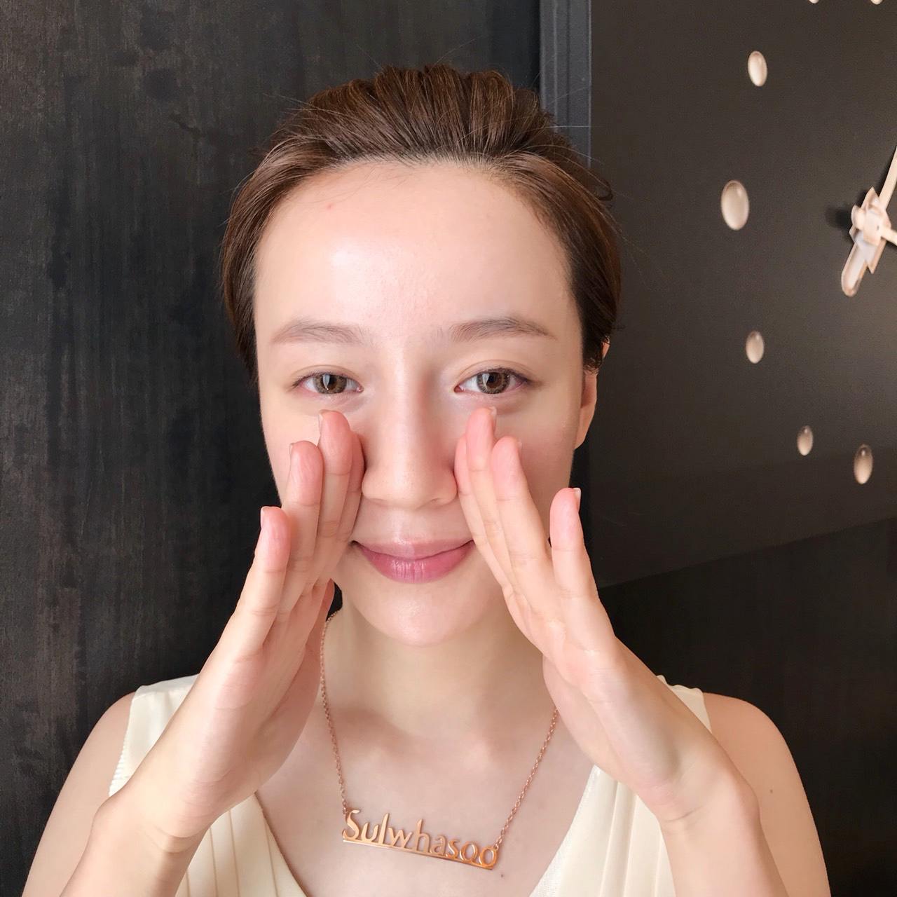 清潔後,先在臉上擦上化妝水打底,接著取適量的安瓶於掌心,先在手掌上溫熱後,輕撫於全臉,雙手握拳以指關節處,從眉毛由下往上推滑到額頭,幫助舒展抬頭紋。