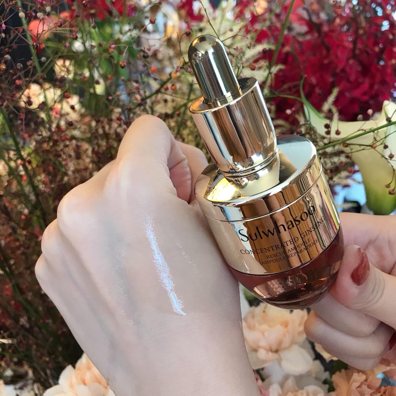 獨家以6000倍人蔘賦活極萃Ginsenomics™及珍稀人蔘果活性精萃打造,以特殊雙劑安瓶,100%保存珍稀人蔘果抗老活性,封存於安瓶內,旋轉開後淡紅色人蔘果精萃才會釋放出,搖晃均勻後再使用。質地相當水潤,在肌膚上稍加按摩後就會完全吸收。