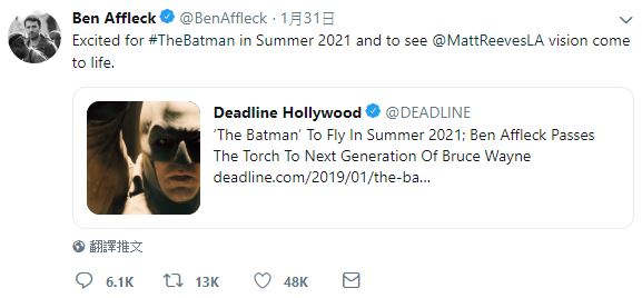 而告別蝙蝠俠的班艾佛列克,也在推特上證實辭演消息並給予《蝙蝠俠》祝福,表示自己依舊對於這部獨立電影很興奮。