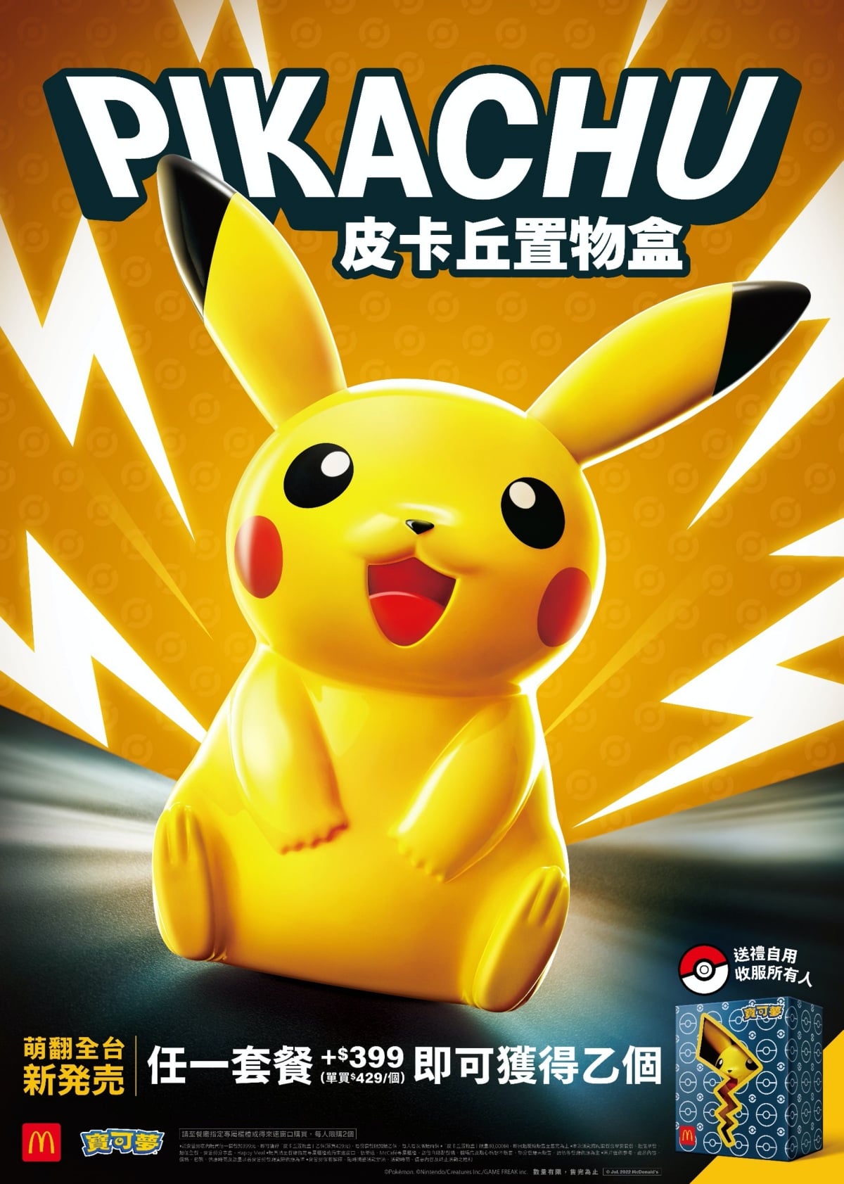 已經擁有多年歷史的超夯動漫角色「皮卡丘」,黃黃的身體加上臉頰旁的小紅暈,一直是很多人心目中的最愛,這次化身成為置物盒,讓妞妞們可以無時無刻都看到超可愛的皮卡丘,只需要購買任一套餐加價399元或是單買售價429元,就可以獲得囉!