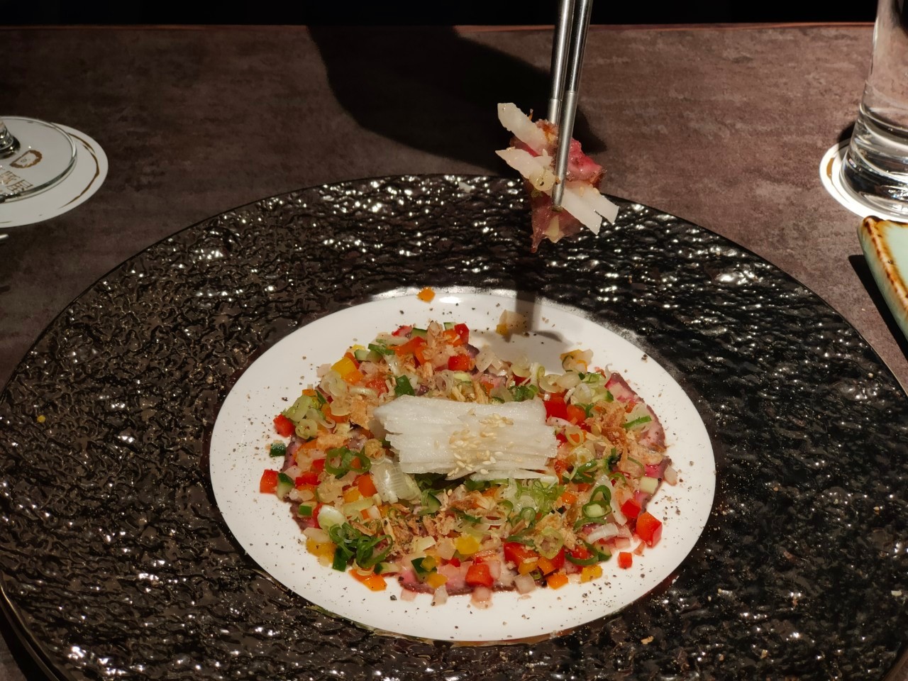 這一次的春夏菜單季節前菜,推出的是紙包料理「特製鐵板韓風美人腿」,在鋁箔紙裡加入茭白筍的皮及果肉,用紙包的方法來鎖住食材本身的香味及甜味,等面前的鋁箔紙澎成圓鼓鼓的模樣,就會有服務人員來為大家端出這道簡單又美味的料理啦。