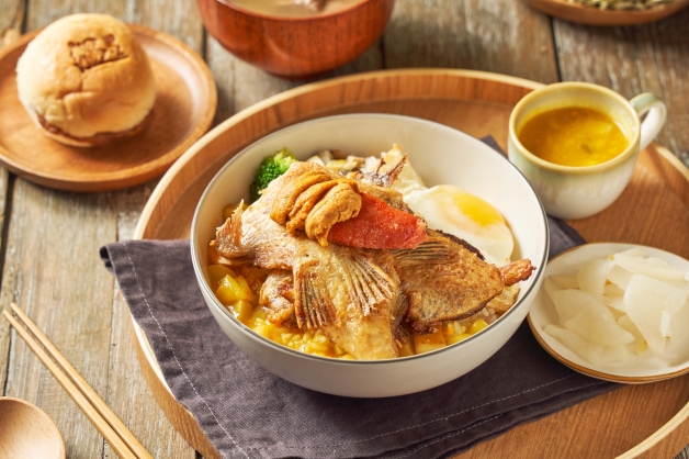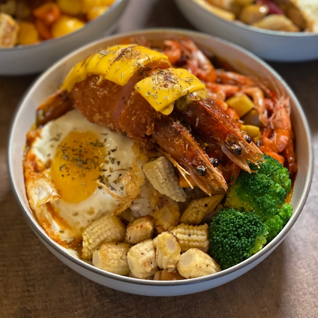 「自製蝦醬咖哩佐手打蝦排」嚴選鮮醇的蝦膏搭配香料做成的濃郁咖哩,蝦膏的甘醇和香料的辛香提升咖哩的質感,特別的地方在於手工現打的自製蝦餅,兩隻大蝦包裹著彈滑蝦漿,外皮金黃酥脆,內餡扎實飽滿!