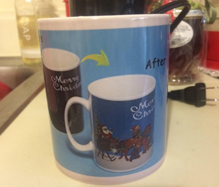 唔...乍看之下這馬克杯的一側應該是黑底白字,另一面就是聖誕老公公駕著雪橇的圖案吧?