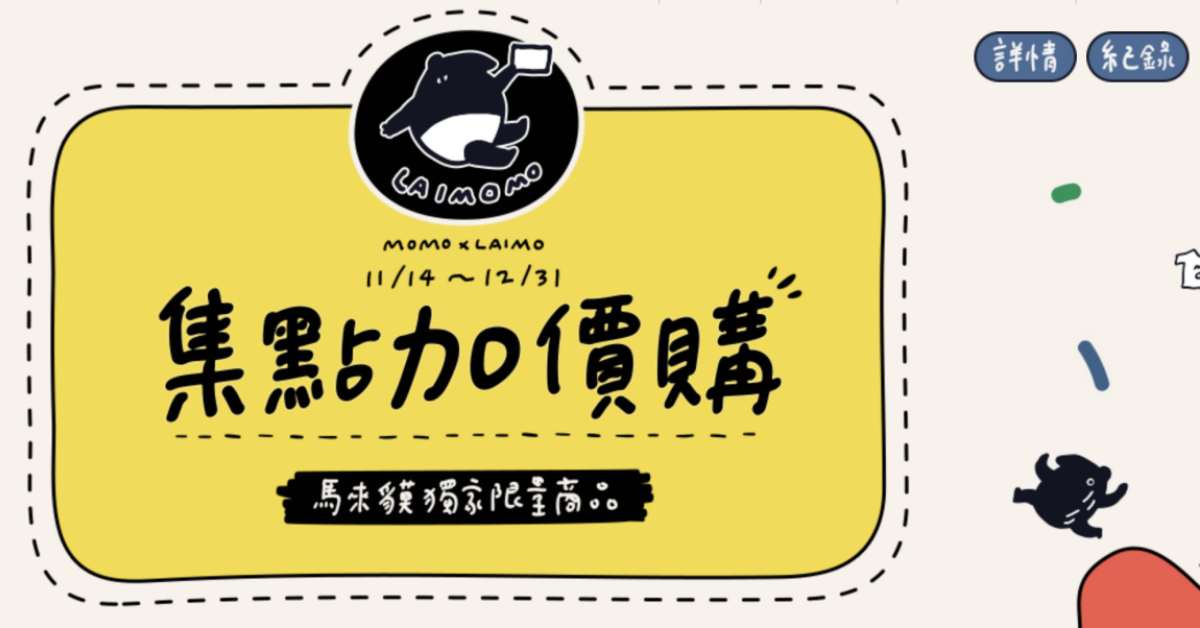 於momo購物網單筆消費滿800元即可領取獲得1點點數,獲得點數可即時至活動頁面查看。活動期間可依照指定時段前往活動頁面登記換購「momo×LAIMO」周邊單品折價券,後可於折價券指定歸戶日期使用折價券加購該商品,逾期恕不補發。