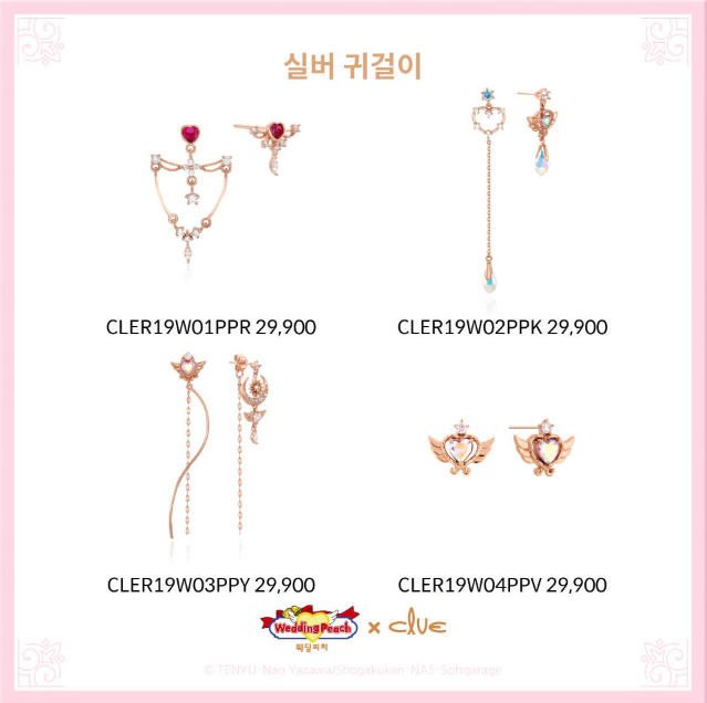 在韓國品牌「clue」的聯名系列中,把《愛天使傳說》裡愛天使們身上的美麗飾品通通飾品化(有點饒口XD),結婚桃子、天使百合、天使德姬、天使賽拉在魔法變身時需要運用的道具飾品、戰鬥配備到變身服裝一應俱全,首先要收的就是經典的聖鏡、聖唇膏、聖手錶變身飾品啦!(聖鏡真的能打開!!!)