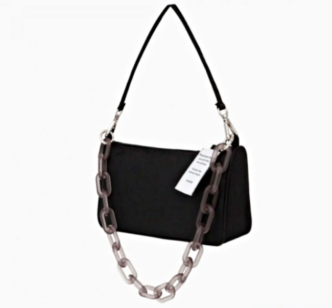 疑似是Jennie自創品牌的「NIEEH」,在他的私服出現頻率超高,包包設計走簡約路線,搭配粗鏈條、透明水晶串珠裝飾等,走俐落、帥氣路線,這咖黑色腋下包要價93000韓幣(大約2150台幣),可拆式鏈條背帶設計可以隨意變換造型,一揹秒變身韓系個性小姊姊!