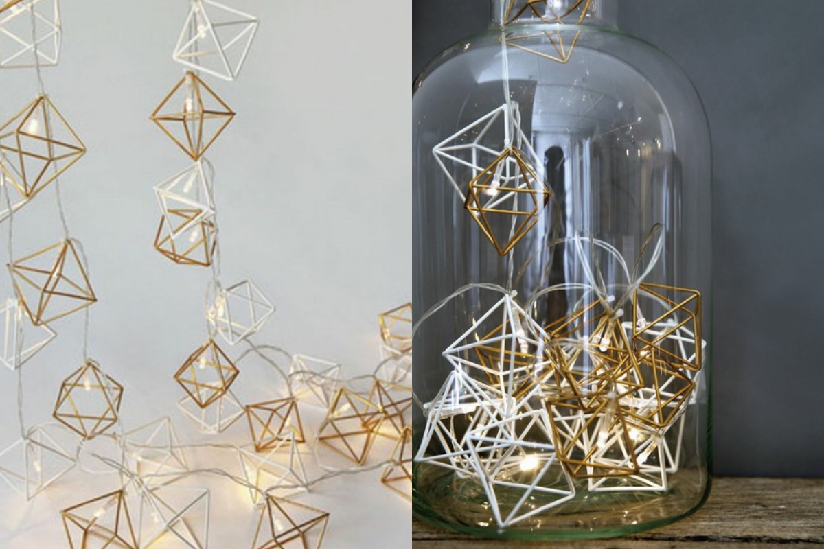聖誕佈置除了聖誕樹之外,可別忘了你還需要一組美麗的燈飾!用金框和銀框彎曲而成的不規則方形燈飾,在玻璃罐中閃閃發亮著,就好像是把滿天的星星偷偷帶回家一樣,迷人而耀眼。