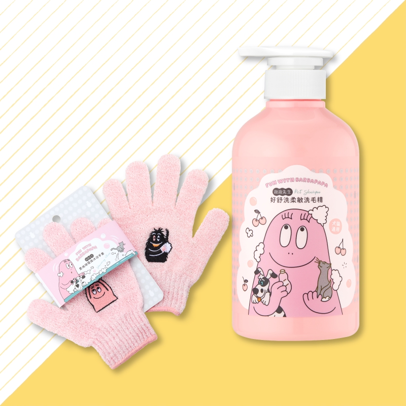 包裝超可愛的泡泡先生好舒洗柔敏洗毛精,添加忍冬以及橙花精油,能溫和幫毛小孩洗香香,有問題肌膚困擾的毛孩子也適用。搭配超可愛粉紅沐浴手套,環保材質非常舒服,可以搓出更多綿密的泡泡,不僅節省洗毛精用量,還能夠輕鬆帶走毛髮髒污,洗澡後毛髮摸起來柔順又蓬鬆。