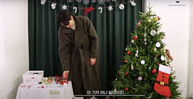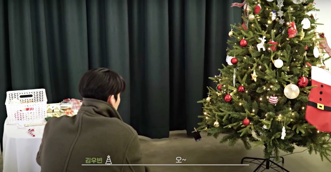 輪到金宇彬登場時,他先是大談小時候的「聖誕樹遭難記」(笑),他表示:「小時候媽媽買了一顆跟我身高一樣高的聖誕樹,沒想到隔天起床樹被封吹倒、整個毀了!」一邊說、一邊拿起桌上的裝飾小物掛在樹上,接著他相中一個坐著聖誕老人的紅色火車吊飾說著:「得掛上火車的吧!」還不忘細心把聖誕老公公翻到正面,最後還打開聖誕燈串預覽一下。