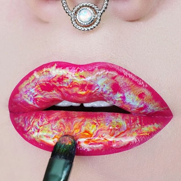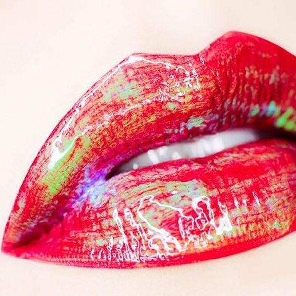 網路上稱這種唇妝為「Hologram Lips」,五顏六色的光澤就這樣混合在一起,在派對的聚光燈照射下,嘴唇滿滿都是霓虹光采,且從不同角度還能產生各式不同色彩,讓人一看就無法移開目光。
